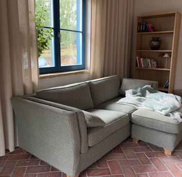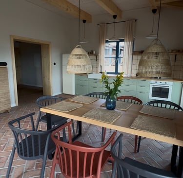 Tu czas zwalnia. Miękkie kanapa, duży stół wszystko zaprasza do posiedzenia, relaksu i spędzenia czasu razem.